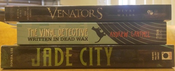 Yeah, I clearly need more practice at taking pics like that. Anyway, I grabbed The Vinyl Detective – Written in Dead Wax by Andrew Cartmell (mostly because Ben Aaronovitch talked a lot about the books on Twitter and whatnot). My Blind Date is with Fonda Lee’s Jade City, described as “Fantasy/Adult” and “The Godfather but with magic” (or words to that effect). And then I also purchased — and got signed — the new version of Devri Wall’s Venators.