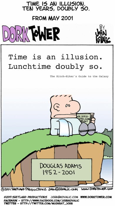 Adams is one of those handful of authors that I can’t imagine I’d be the same without having encountered/read/re-read/re-re-re-re-read, and so I do my best to pay a little tribute to him each year, even if it’s just carrying around a towel (I’ve only been able to get one of my sons into Adams, he’s the taller, thinner one in the picture from a couple of years ago below).