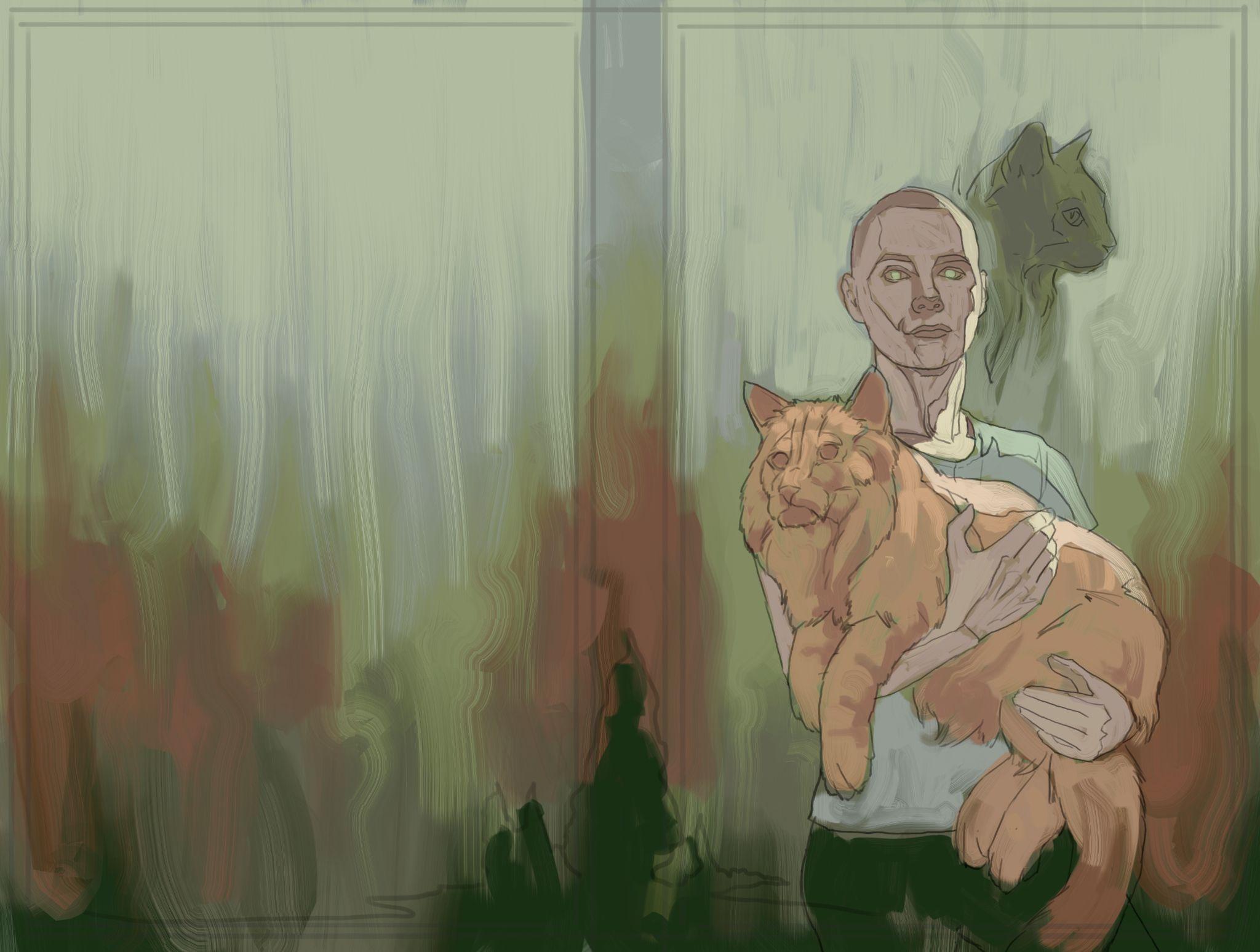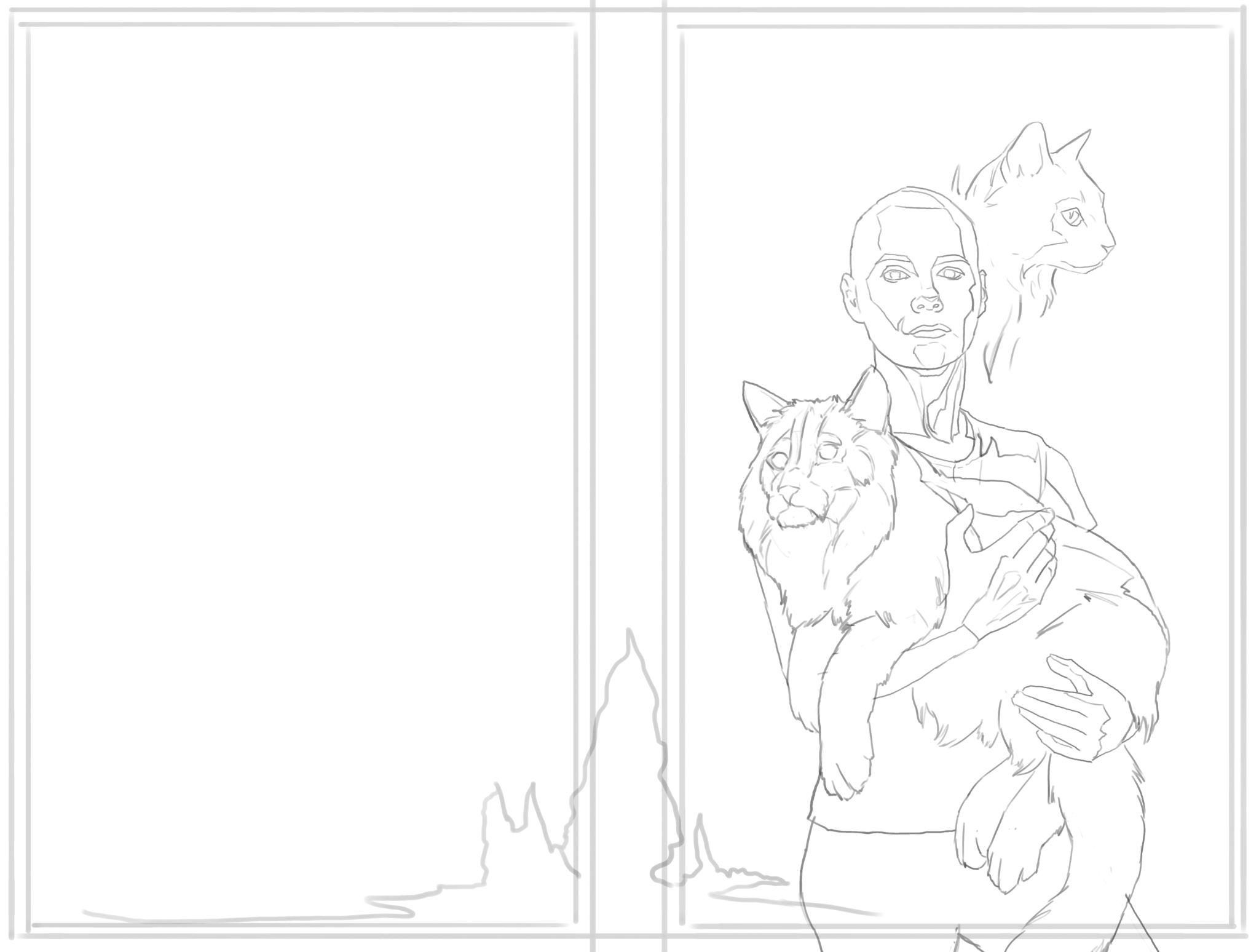 Shannon: Rather than internet photos, I started with photos of my own cats. This story began because of the death of my cat Gandalfr. He’s a 17.5-pound, gray cat, and my fictional cat is the same size. I shared photos of G for the cat the protagonist is holding. However, I made my fictional cat a ginger tabby, so we also needed references of that. The cat that appears behind the woman is modeled after my current cat, Little Bat. In fact, the woman’s head is modeled after my head. Candra made changes, but she referenced my previous cat, my current cat, and myself in the painting.